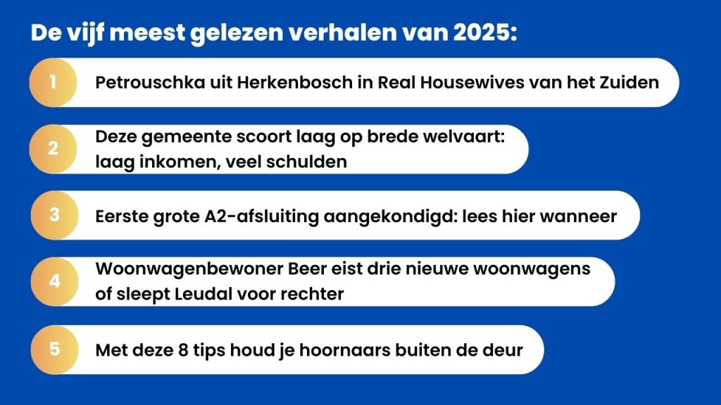 Uit de top vijf meest gelezen verhalen blijkt dat de lezer behoefte heeft aan verschillende soorten verhalen. Bijvoorbeeld entertainment, want de deelname van Petrouschka Dahmen uit Herkenbosch aan het Videoland-programma The Real Housewives van het Zuiden wist de meesten te interesseren.